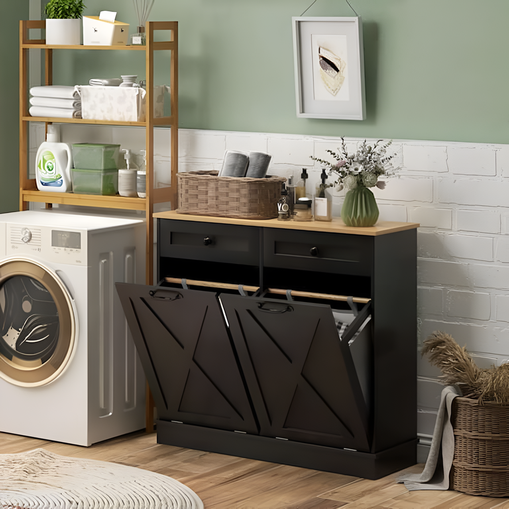 Above the laundry compartments, the two spacious drawers provide generous room for bathroom essentials such as towels, toiletries, detergents, or hair tools. This extra storage helps reduce countertop clutter and makes the cabinet especially useful in bathrooms with limited vanity space.